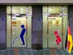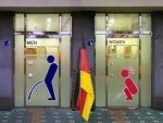 Lo curioso ocurre cuando situamos la bandera alemana entre las dos puertas, lo cual nos indica que hay al menos un alemán ocupando uno de los servicios. Aquí, nos sentimos tentados a concluir que la probabilidad es la misma que en el caso anterior, ya que igualmente habrá un baño ocupado por un/a alemán/ana, y hay un 50% de posibilidades de que en el otro hay otro alemán/ana. Pero en contra de lo que aparentemente parece de sentido común, la solución es muy distinta.