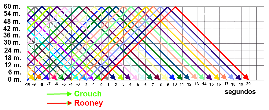 También podemos resolver el problema de una forma gráfica, dibujando la posición de cada jugador respecto de la banda inicial en cada momento de su carrera. Como podéis ver en el gráfico de abajo, el recorrido de Rooney se cruza con el recorrido de 20 compañeros (incluyendo a Crouch, con el que se cruza en el segundo 0:00).
