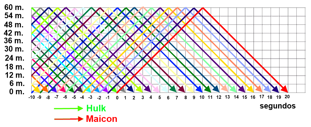 También podemos resolver el problema de una forma gráfica, dibujando la posición de cada jugador respecto de la banda inicial en cada momento de su carrera. Como podéis ver en el gráfico de abajo, el recorrido de Maicon se cruza con el recorrido de 20 compañeros (incluyendo a Hulk, con el que se cruza en el segundo 0:00).